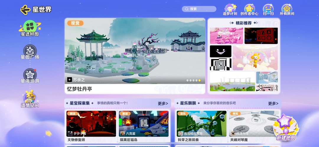 除了官方提供的“竞速闯关”、“生存闯关”、”大乱斗“、”武器大师“、“躲猫猫”、“谁是狼人”等玩法,在《元梦之星》星世界里还有更多玩家创作的地图,且有不少做得有模有样。