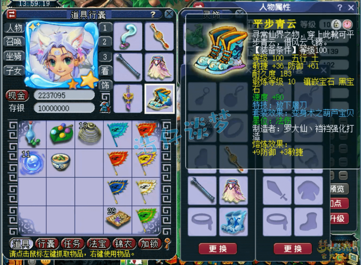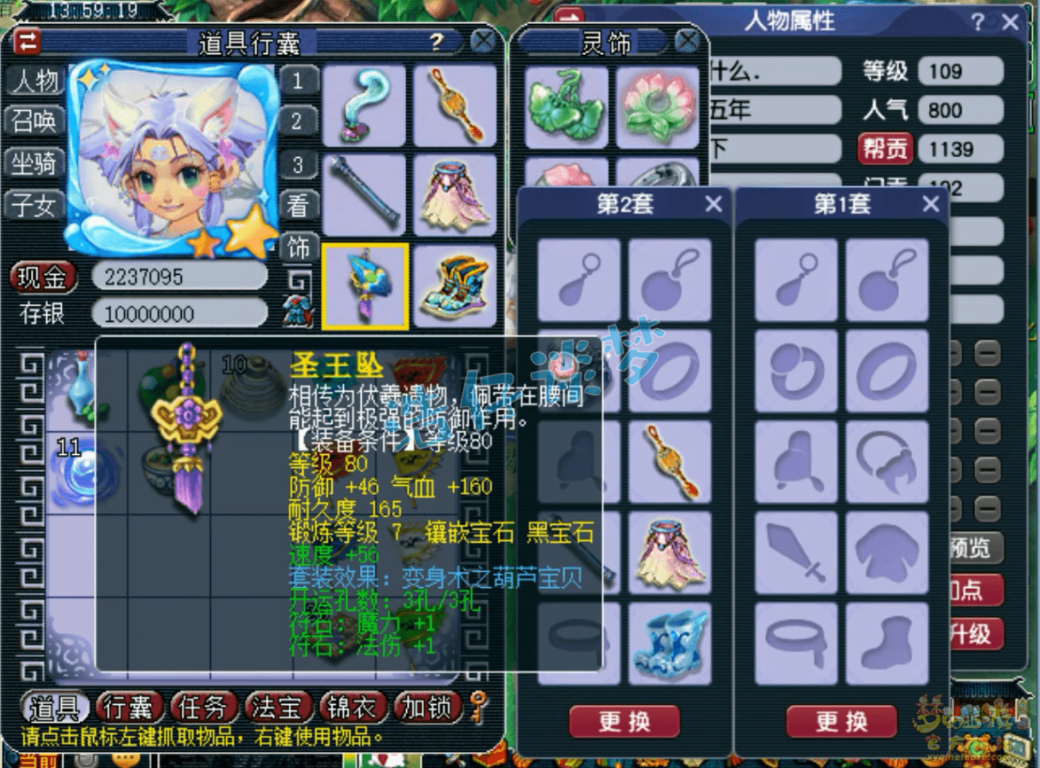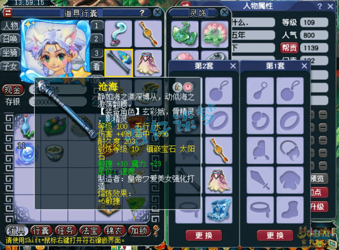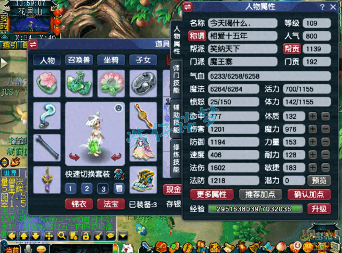 好了,这个109级魔王寨展示完毕,除了腰带之外,其他部位都是10锻动物套,算是比较标准的百套号!这种号几乎可以通刷所有难度任务了,杀天罡地煞是她每天的常态!闲暇的时候还可以打一打PK,跟几个志同道合的好友一起种种树,美滋滋!