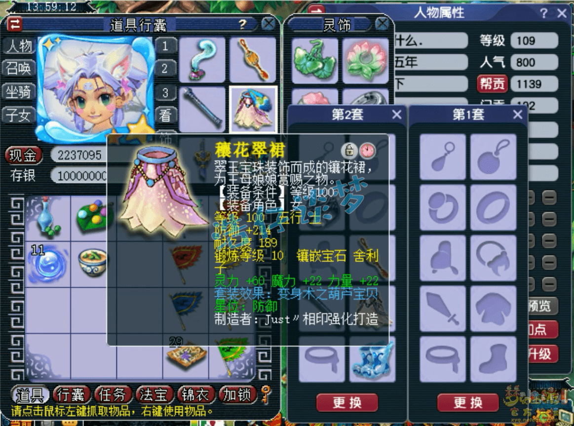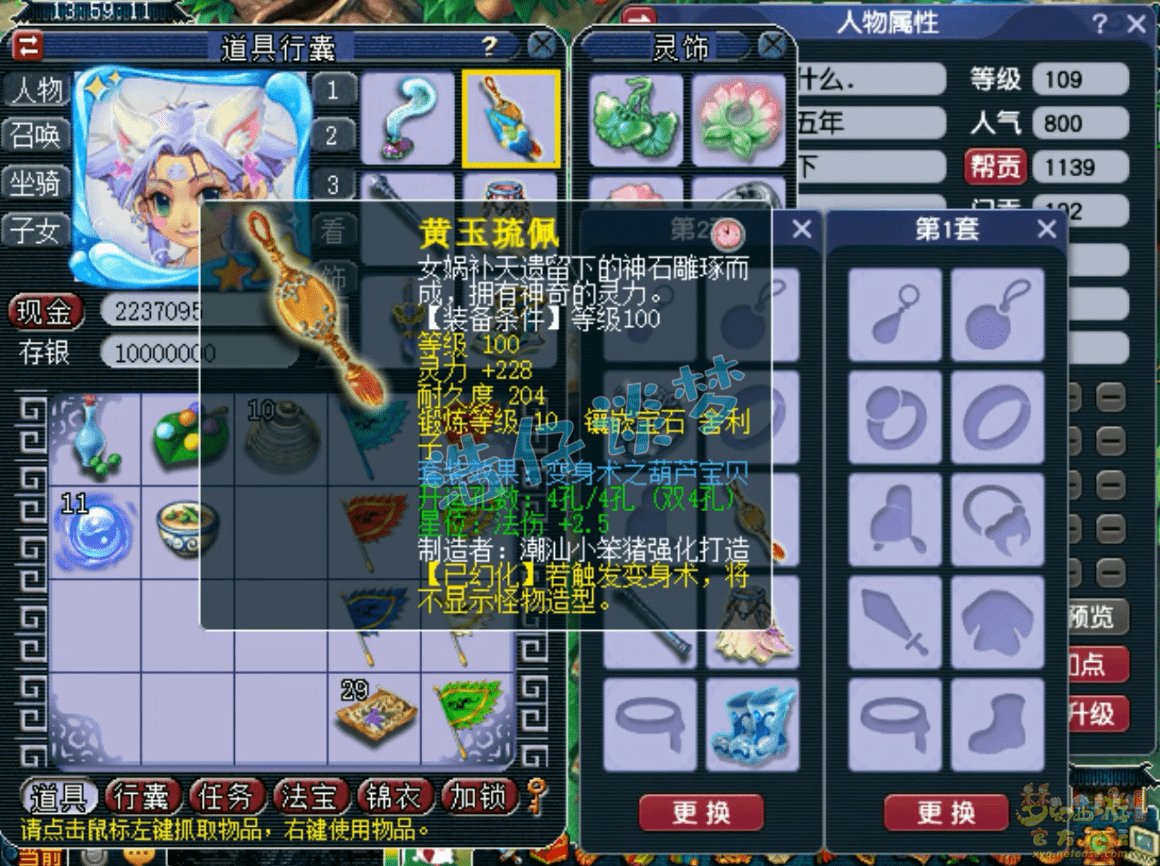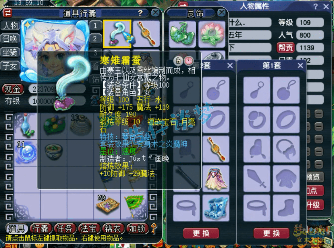 100级葫芦宝贝套女衣,魔力双加44,打了10锻舍利子!