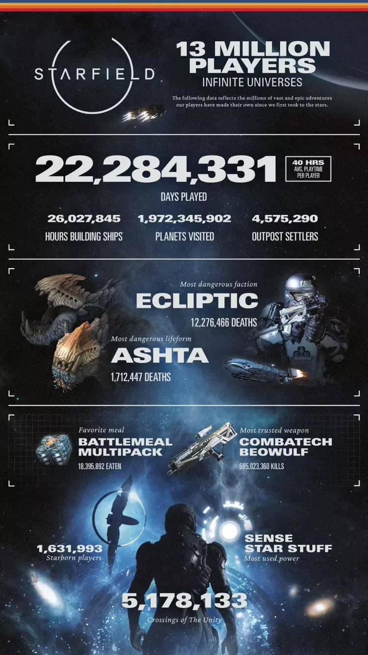 IT之家 12 月 21 日消息,B 社(Bethesda Game Studios)今天发布报告,自 9 月 6 日发行《星空》以来,这款游戏在线玩家数量已经超过 1300 万,平均每位玩家游戏时间超过 40 小时。
