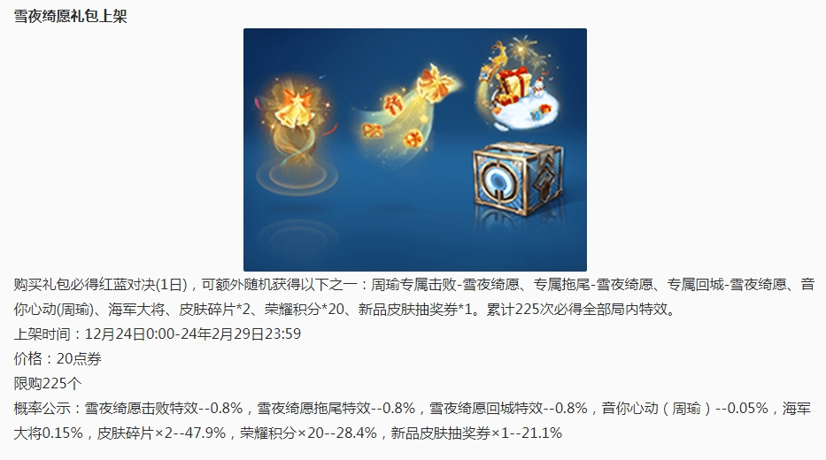 首先是周瑜圣诞主题的新皮肤雪夜琦愿的爆料,终于确定了上线时间和获取方式。这款皮肤之前已经爆料过造型和局内特效,已经没有什么悬念了。而且圣诞主题皮肤,上线时间也基本确定。唯一不确定的就是皮肤品质了。现在公布,依旧给了玩家们一个大大的惊喜。