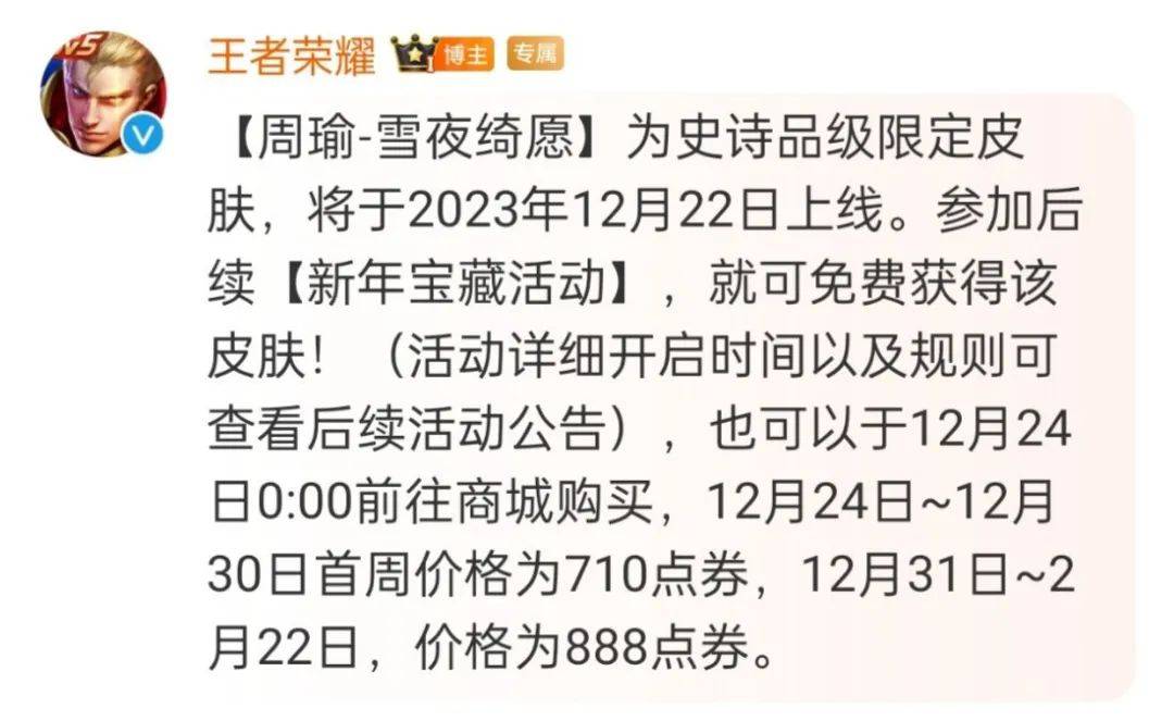 周瑜的雪夜琦愿,为史诗品质皮肤,有圣诞限定标签。最重要的是,这款皮肤,可通过“新年宝藏活动”获取,这就很难得了。免费的史诗皮肤,还是限定皮肤,确实少见。如果没记错,上一款还是猪八戒的猪悟能皮肤。而周瑜雪夜琦愿皮肤,将于12月22号上线。当然,如果不想参加活动,也可以在12月24号平安夜的时候,通过商城渠道入手。