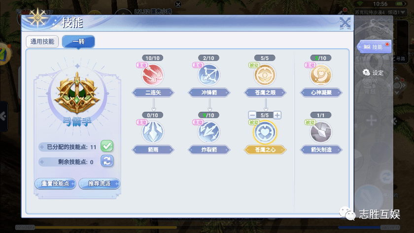 对于六大职业来说属性固然重要,但是技能的加点也是非常重要的,还是以弓箭手为例,志胜这里建议大家主动技能主加二连矢和炸裂箭,被动技能则是以苍鹰之眼、心神凝聚、苍鹰之心为主;