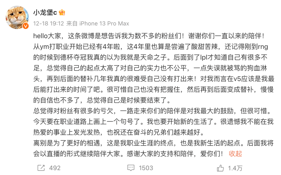 就算是在NIP他大部分时间也都在板凳上,偶尔有过一些登场,但大家似乎也已经淡忘了那个曾经带着光芒的小龙堡!在2023年冬季转会结束,他始终没有找到自己的去处,在前段时间更新了微博表示自己将要退役,因为起点太高导致慢慢的迷失了自信,如今就只好退役了,未来会以直播的形式陪伴粉丝们!不得不说他这一路确实太难受了,有实力但是带着星光太受关注了,最后却打出了反向,选手自己的情绪和自信确实慢慢的难以找回,也成为PDD最失落的门生!希望未来一切都好吧!