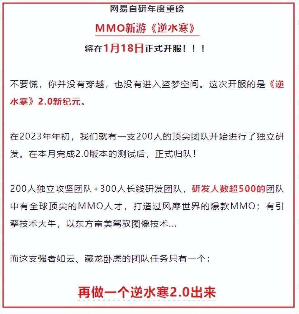 在这里要告诉大家一句,不用担心,逆水寒2.0是《逆水寒》的迭代产物,这是由网易一支200人的顶尖团队进行独立研发,在本月完成2.0版本的测试后,正式归入大部队,而逆水寒将在1月18日正式进入2.0新纪元。