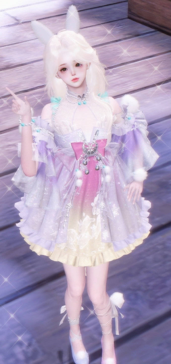 浅紫色小裙子也是可爱爆表,搭配金发更显娇俏,胸前的粉色蝴蝶结和裙摆处的鹅黄配色更衬得整个人十分有灵气,谁能想到一套时装居然能同时包含好几种配色,不得不说《逆水寒》手游玩家真的太有才了。
