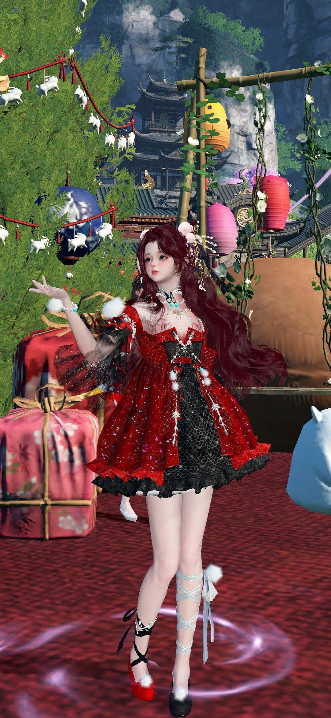 还有玩家分享了红黑色染色,这种搭配有乍一看是走轻熟路线的御姐,但是时装上的毛绒球点缀又给人一种活泼小女孩的可爱气质,轻松驾驭轻熟风和可爱风两种风格,瞬间被种草了这个染色方案。
