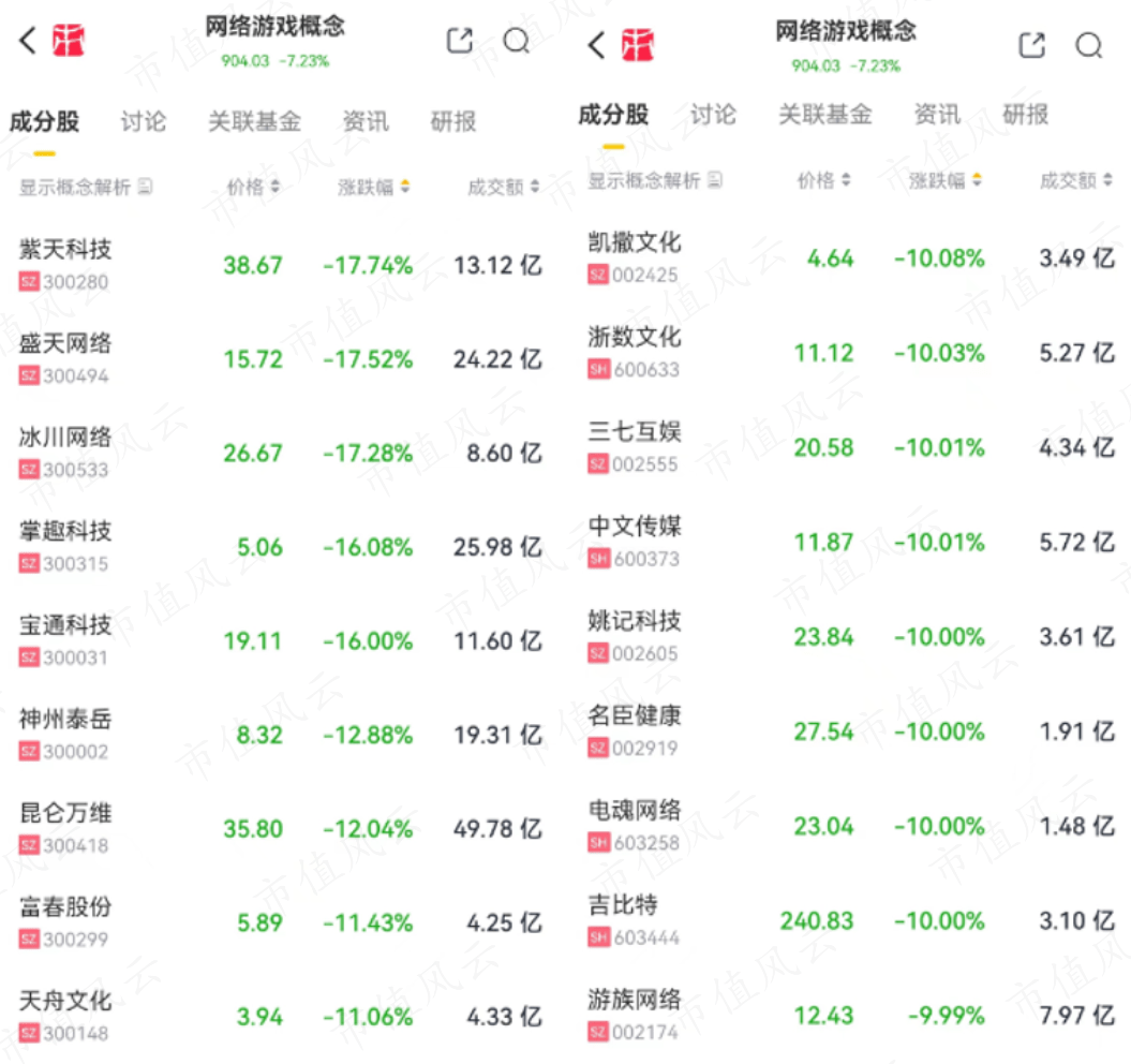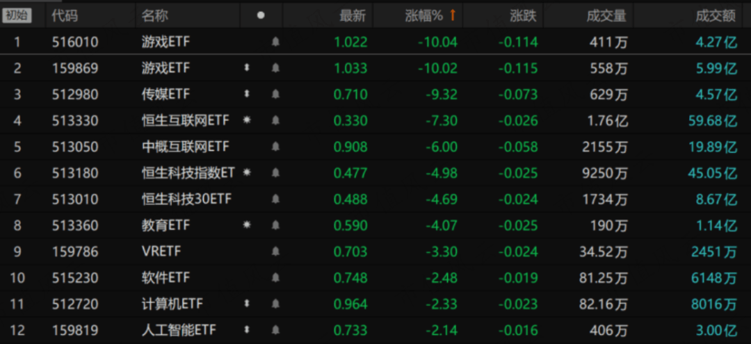 游戏ETF和传媒ETF受此影响今日跌停,恒生互联网等相关ETF也出现不小的跌幅,不相关的软件、人工智能等ETF同样受到影响。