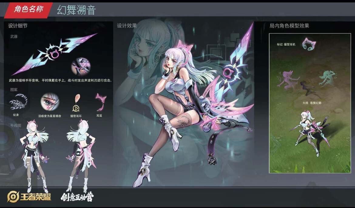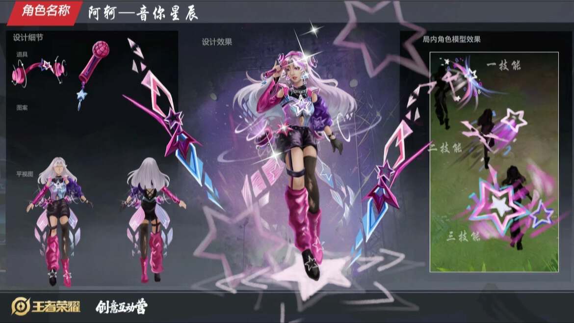第二款阿轲的皮肤设计稿名为音你星辰,这款皮肤有点科技风,现代风。阿轲作为一个主唱,十分的美丽,有活力。阿轲穿着高筒靴,走起路来,也很有味。技能特效五角星,也还挺有趣的。这款皮肤适合6元史诗的品质,如果上架的话,把脸部优化一下,销量应该会特别好。