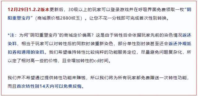 综合算下了还是很值的,毕竟《逆水寒》手游里面就两种性别,应该不会有玩家在游戏中翻来覆去的转性,再说官方还送了所有玩家一次免费转性的机会,对于普通玩家来说足够了。