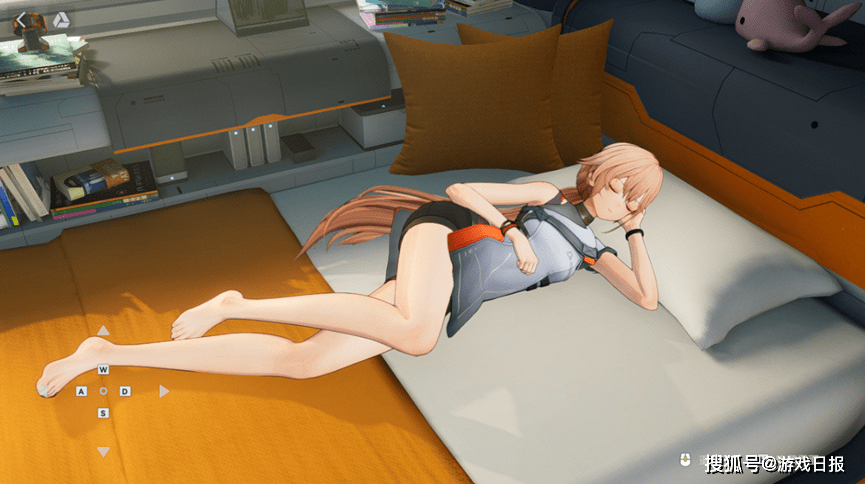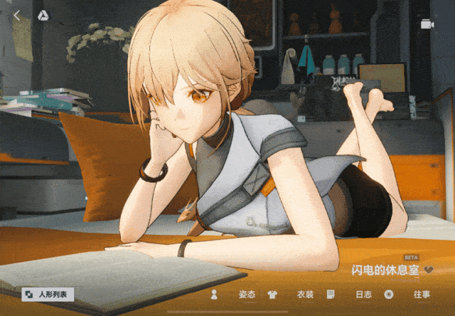 其中,点击姿态可以根据人形等级解锁可解锁闲适、阅读、熟睡、观察、思考等姿态。和煦温暖的灯光、松弛悦耳的BGM,温馨惬意的房间和完全放松下来慵懒阅读着的人形,将松弛感传递给到了玩家,让人形的陪伴和交互能疗愈心灵带来快乐和充实感。