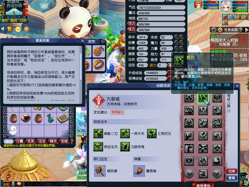 无论你是新手,还是刚刚回流的老玩家,都可以试试九黎城。这个门派不仅可以携带两种套装效果,输出能力也非常强。通常情况下,69级的九黎城只带两把普通简易武器的话,就可以达到1250点伤害,如果是有坐骑、满潜能的话,可轻松突破1400点。