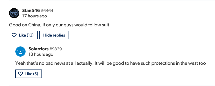 在 Eurogamer 的报道文章下,一位玩家评价道:“对中国来说很棒,如果我们也能效仿就好了。”另一位玩家赞同了他的观点,表示“这根本就不是坏消息。如果西方也能有这样的保护就好了。”