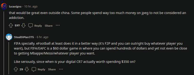 另一位玩家则对“限制玩家消费额度”的规定评论称:“即便在中国以外(这条规则)也很棒。有人在 Jpeg(图片)上花了太多钱,不能不被认为是一种瘾。”一条回复回应了他的说法,并表示:“特别是《FIFA》。《eFootball》至少以更好的方式做这一点(游戏本体免费,可以直接购买任何你想要的球员),但 FIFA/EAFC 是一款 60 美元的游戏,你可以花数百美元,也依然根本拿不到姆巴佩/梅西/任何你想要的选手。”EA 的《FIFA》游戏的开箱也是当初欧盟对游戏战利品箱监管的主要目标之一。