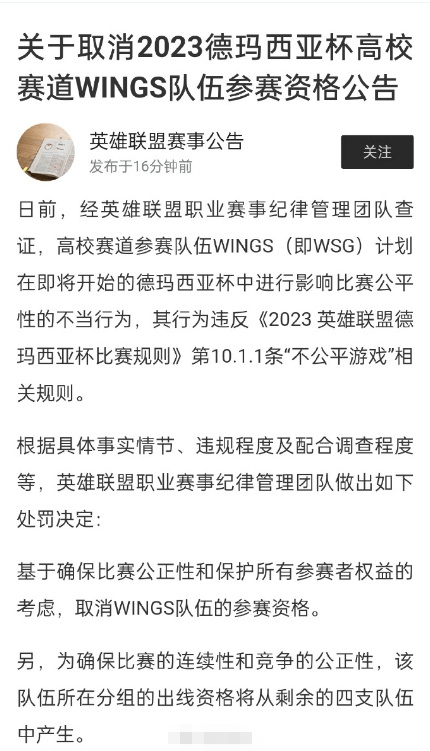 从LOL赛事官方的措辞来看,无疑是这支高校赛道的参赛队伍想要在德杯进行假赛,从而导致受到被取消参赛资格的处罚。而LOL官方可能是收到了举报,也可能是WINGS队内有选手不希望参与打假赛的事与其他人同流合污,最终WINGS的计划提前败露,没有让他们在比赛开始后真的影响到比赛的公平,这也是让很多LPL观众直呼“干得漂亮”。
