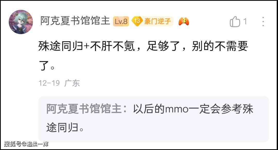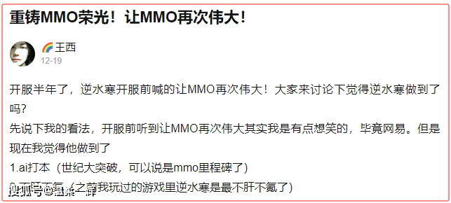 发起这一话题的,是传统MMO老玩家。据他所述,最开始看到这句宣传词,他第一感觉是想发笑。觉得MMO游戏的辉煌和多达十几年的积重难返,怎么能是网易一款手游能改变的。但是在玩了游戏半年时间之后,他越来越觉得,网易已经做到了。