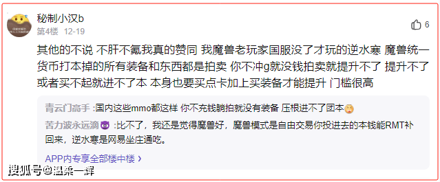 这一说法,获得了其他玩家的附和。甚至有《魔兽世界》玩家表示,就“不肝不氪”这一点,《逆水寒》手游甚至比《魔兽世界》都要出色。在国服的特殊环境下,魔兽玩家不充钱换金就没钱拍装备获得提升,游戏门槛还是比较高的。但《逆水寒》手游却根本没门槛,即便是新人玩家,入坑一两周也能追上大部队,体验太好了。