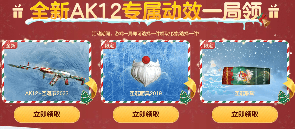 首先是2023 圣诞系列暖冬礼物盒来袭,登录可领超特别的黑色烟雾弹、特效级武器,还有历代道具大量返场!12.23-12.29,游戏—局即可领取AK12-圣诞节2023、圣诞面具2019、圣诞彩砖,三选一,仅能选择—件!