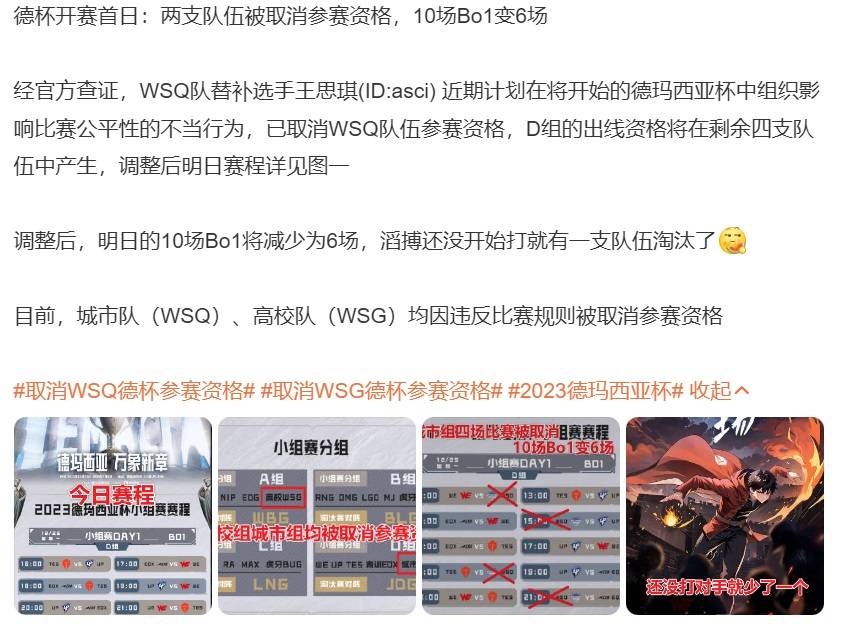 没想到的是在开赛之前官方突然发布公告,有两支战队被查出计划在即将开始的德杯中进行影响比赛公平性的不当行为,被官方直接取消了参赛资格。
