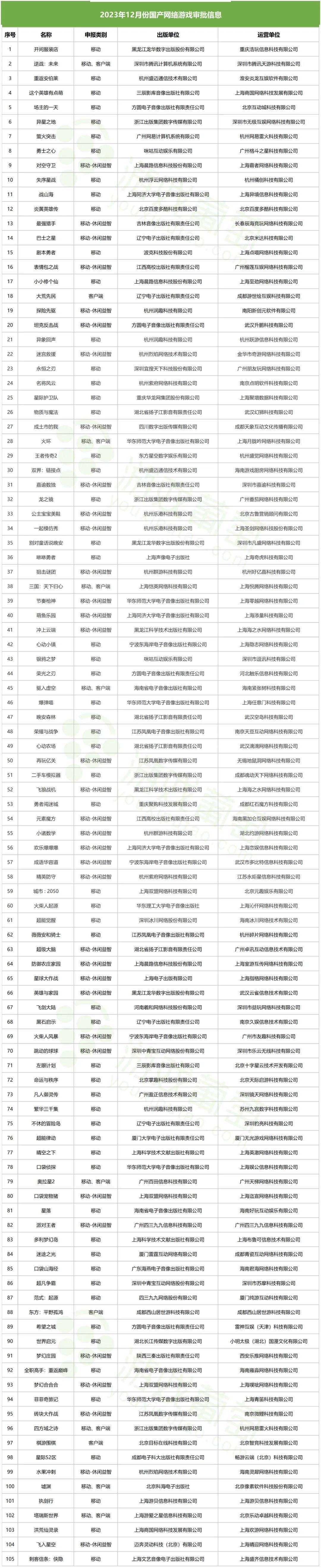 12月25日,国家新闻出版署公布了2023年12月份国产网络游戏审批信息,共有105款游戏过审(文末附有完整名单)。
