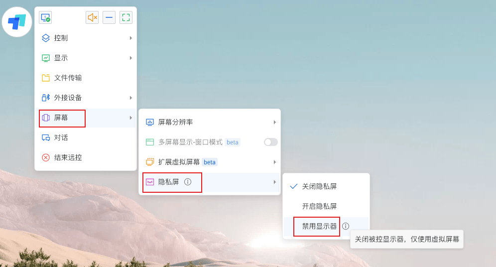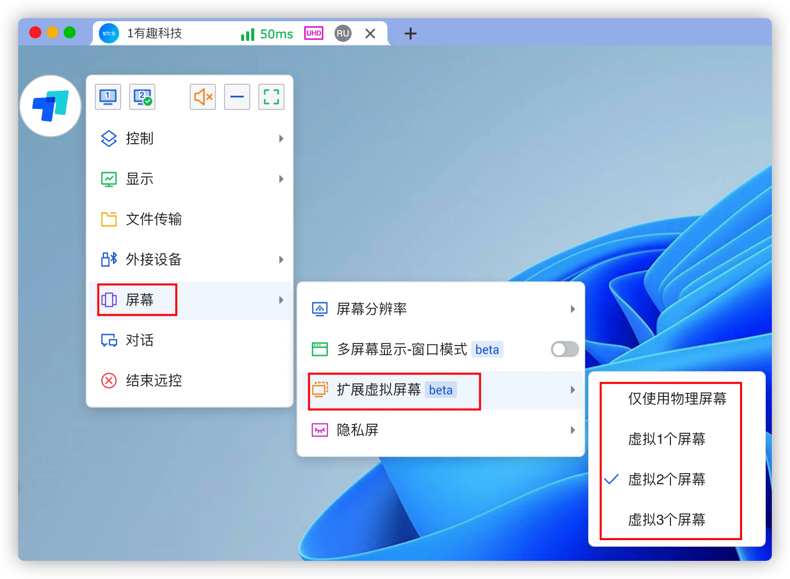 当远程到被控后,点击悬浮菜单栏-屏幕-扩展虚拟屏幕,可以选择虚拟1-3个屏幕,被控即可开启多屏体验。