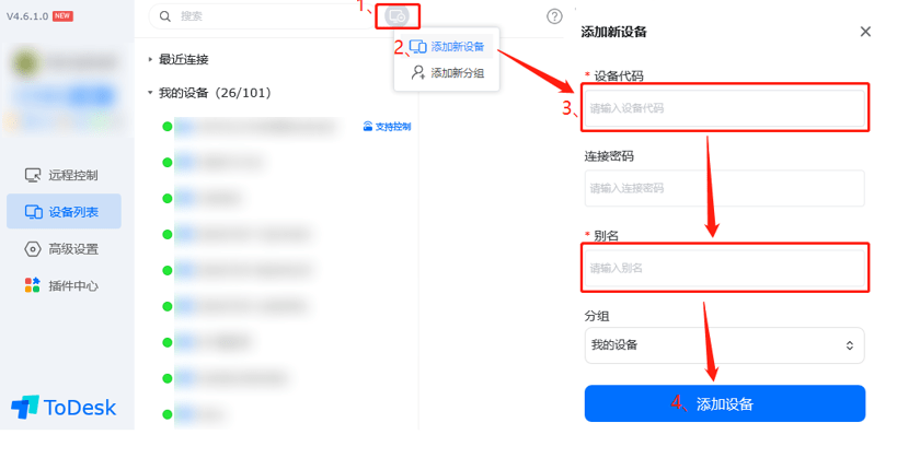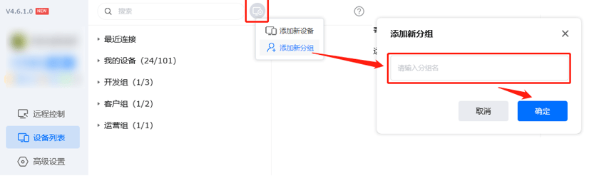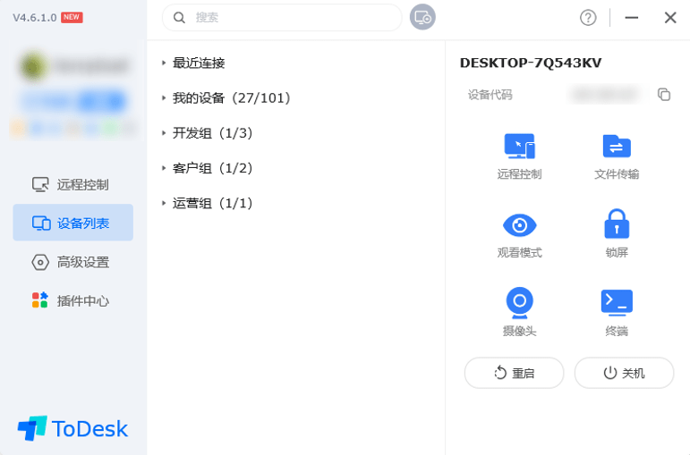 在设备列表中,分组查询选择,或是在最近连接-我的设备中选择目标设备,即可进行远程控制、文件传输、查看设备周围环境等操作;能够更加快速的连接设备并知悉工作室的情况。