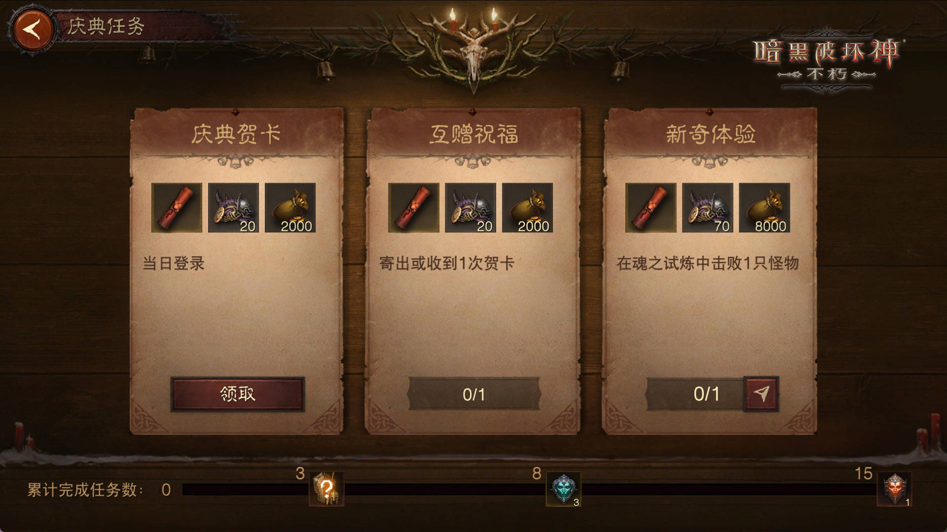 庆典狂欢不停,每日惊喜不断!鹅毛大雪飘落覆盖着庇护之地,似乎抚平了过往的悲伤和痛苦,是时候享受这短暂的安宁了。临冬节活动期间每日还将刷新3个不同类型的庆典任务,玩家可轻松完成收获临冬节贺卡和其他大量奖励,累计完成多个任务还能获得随机传奇装备和强化不朽钥石!