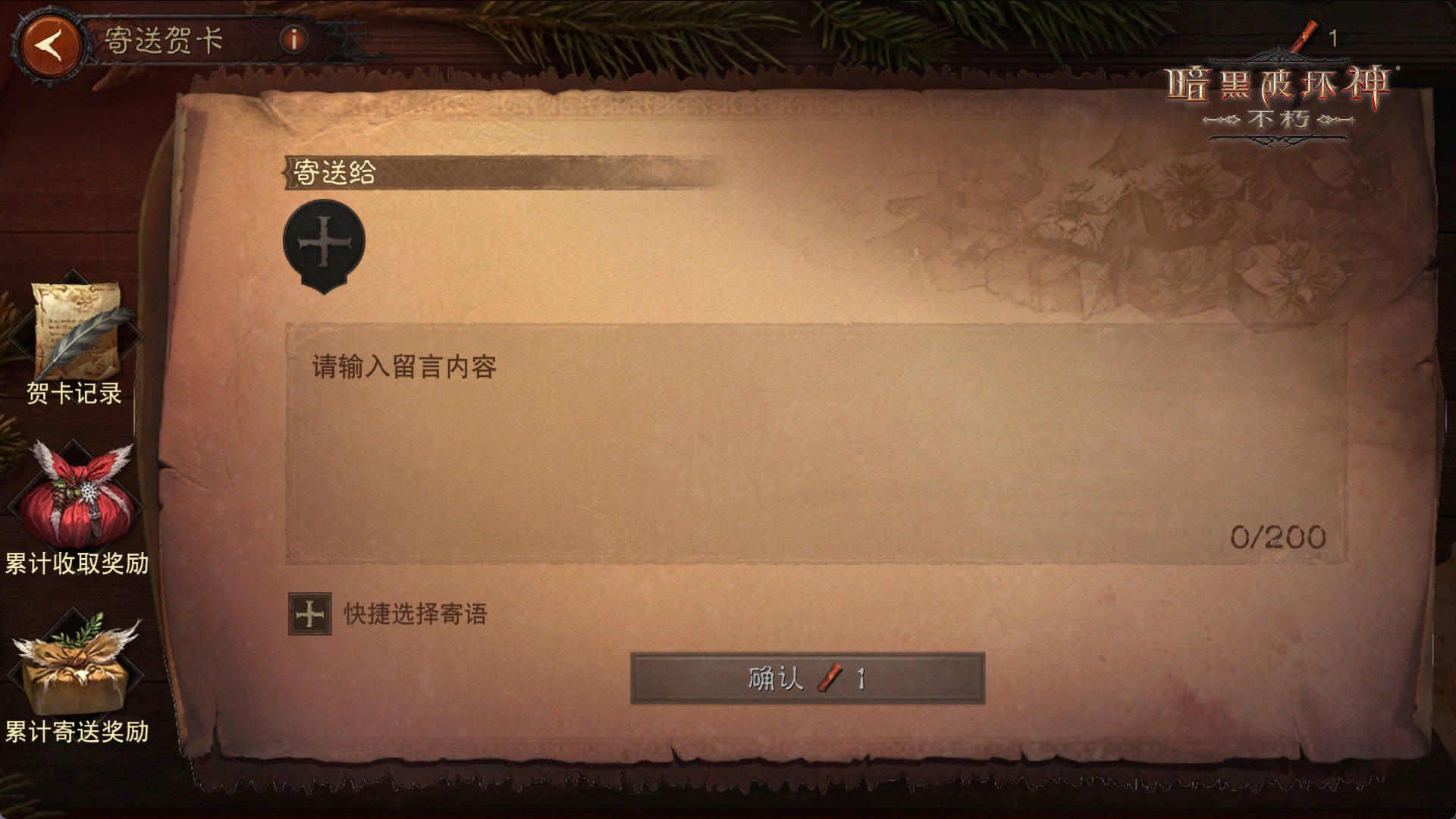 暗黑不朽,情谊长存!冒险途中你是否遇到过难忘的伙伴、合拍的队友?随着临冬节的开启,玩家通过完成庆典任务获得的贺卡,可以用寄送的方式向他们送去自己真挚的祝福。活动期间累计收取和寄送贺卡均可获得丰厚奖励,赶紧用文字送出你的祝福吧!