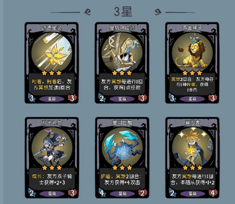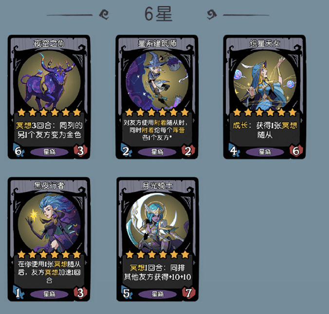 作为一个后期发力的卡组“星裔”的三星卡是重要过渡时期,所以游戏内一共加入了六张三星卡。而最重要的大概是冥想之后能够给到经验的随从“星轨测绘师”了,这张卡能够给冥想随从进行一些额外收益,特别是获取经验的特性,能够迅速上本衔接后期的战斗。当然这张卡也是依旧保持了“星裔”身材不行的特点,基本上没有战斗力。