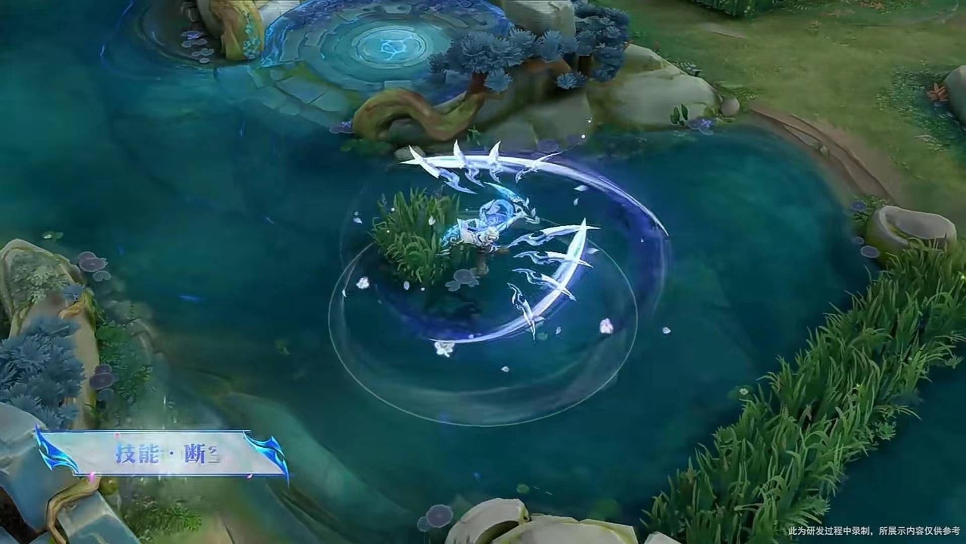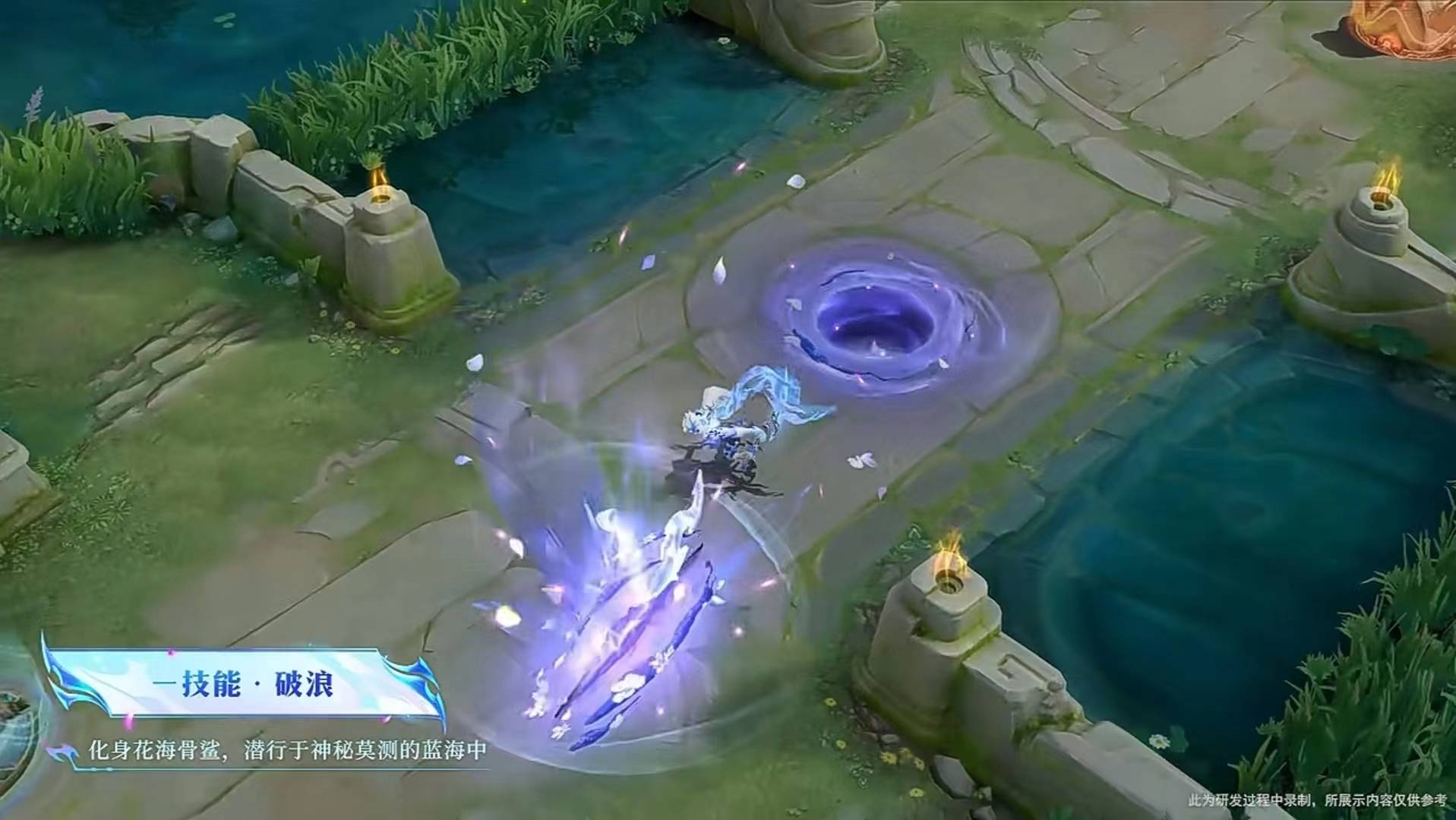使用一技能的时候,澜会化身为花海骨鲨进入下潜状态,两侧有蓝色灵鱼伴游,一技能出水的时候,刀刃会带出蓝紫色锋芒,将前方大地劈出一道裂隙,并散发出幽蓝色的花朵。