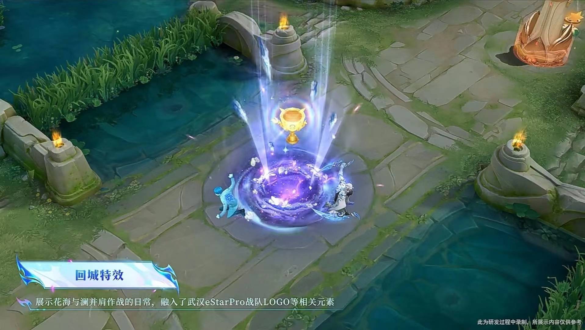 回程特效保持了FMVP系列一贯风格,那就是皮肤和皮肤的主人共同出场,展示了花海与澜并肩作战的日常,脚下的“黑洞”特效,出现了武汉eStarPro的Logo标志,并且还融入了一句语音台词: