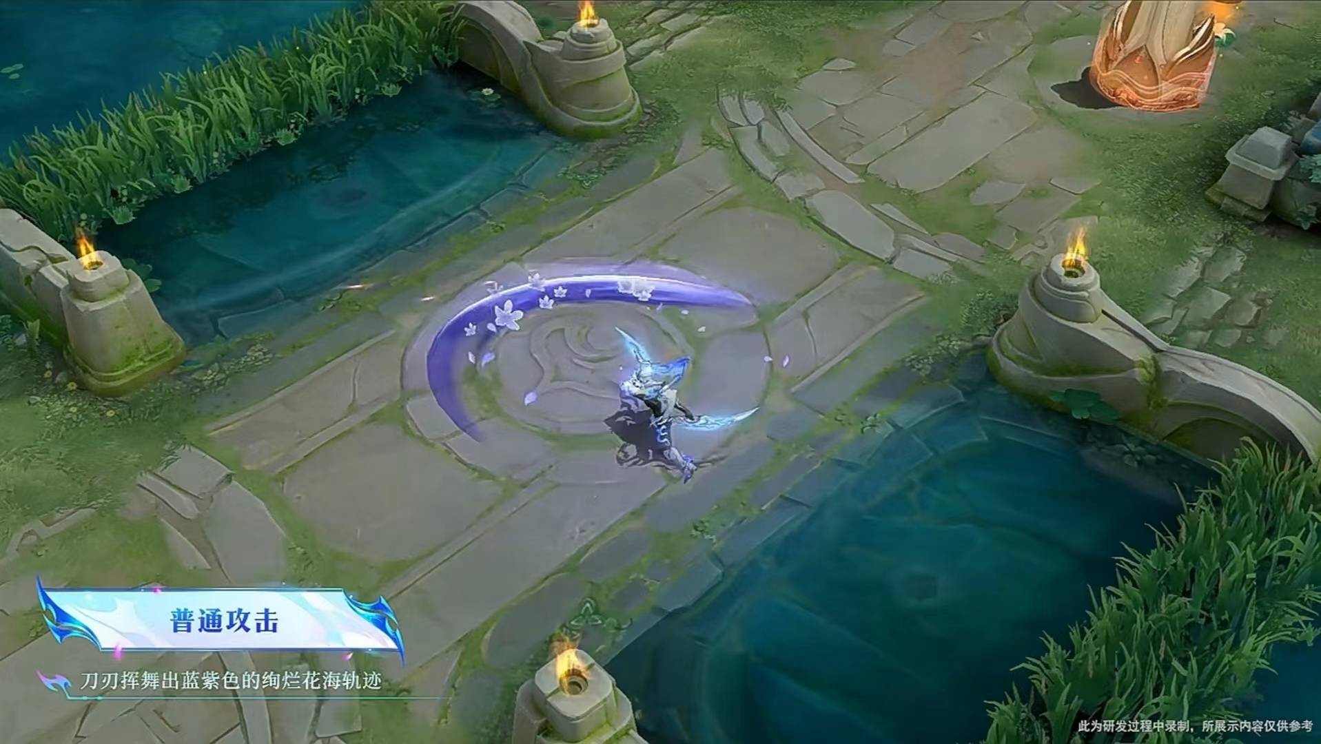 澜在普攻的时候,刀刃能挥舞出蓝紫色的刀光,并点缀着绚烂的花朵。