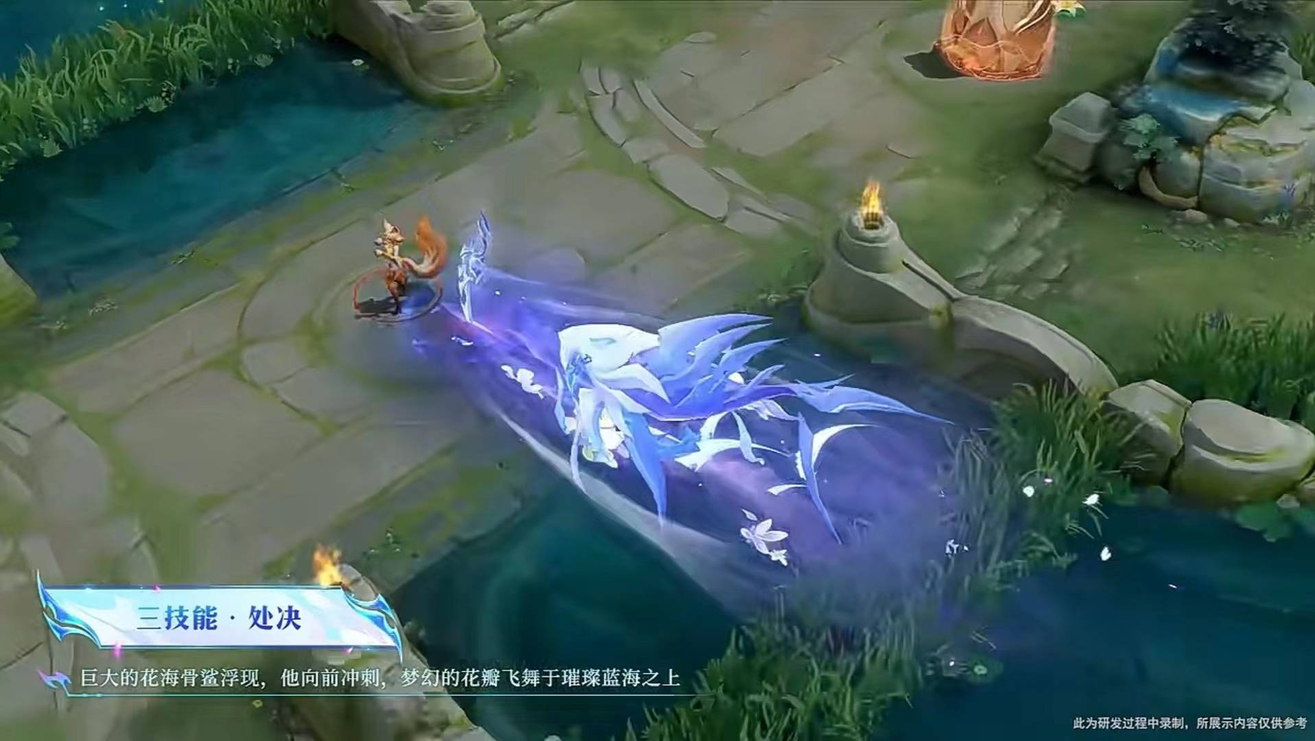三技能更是化身为一条巨大的花海骨鲨,猛力向前冲刺,两侧伴有梦幻的花瓣飞舞,看起来十分带感。