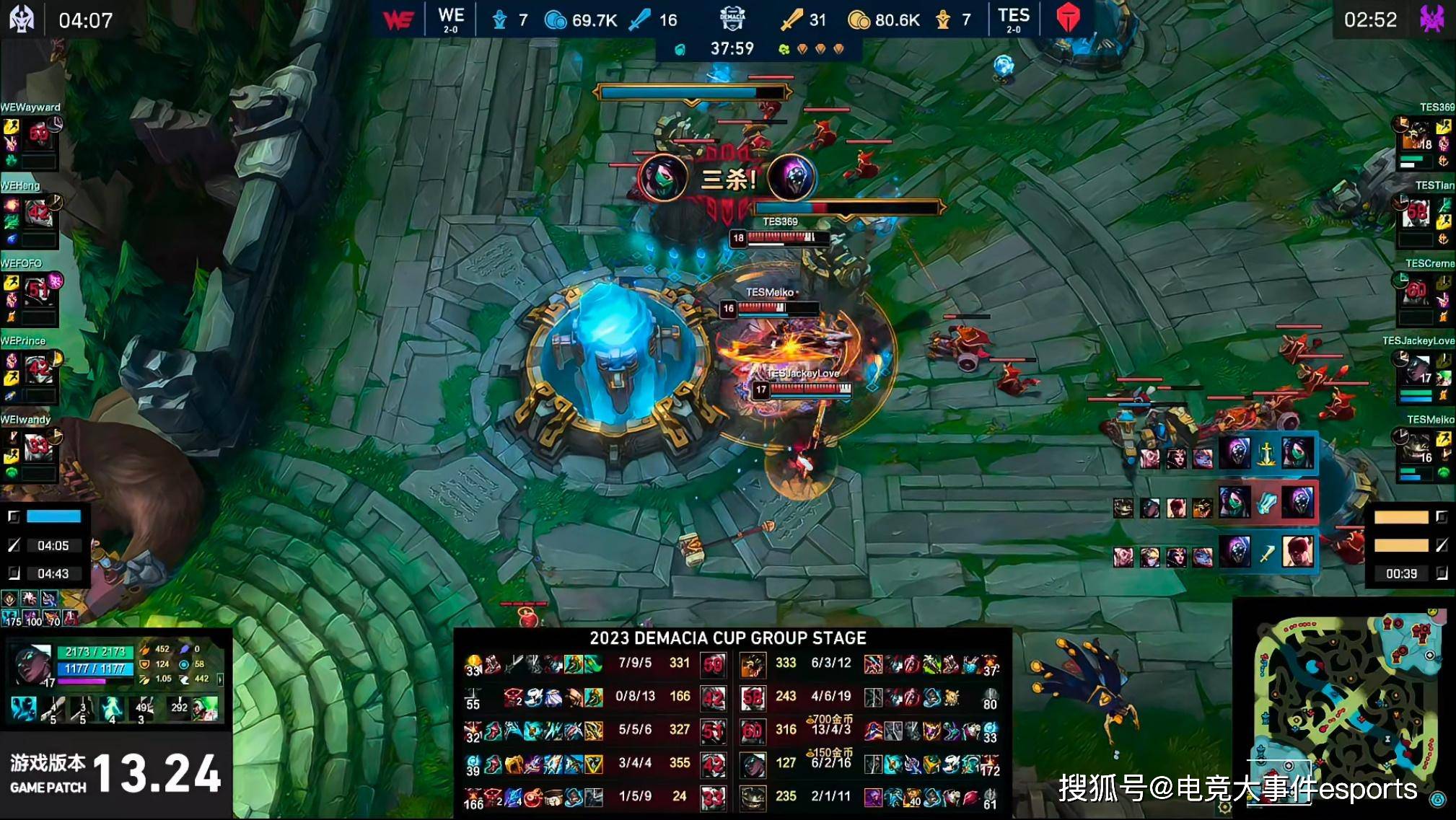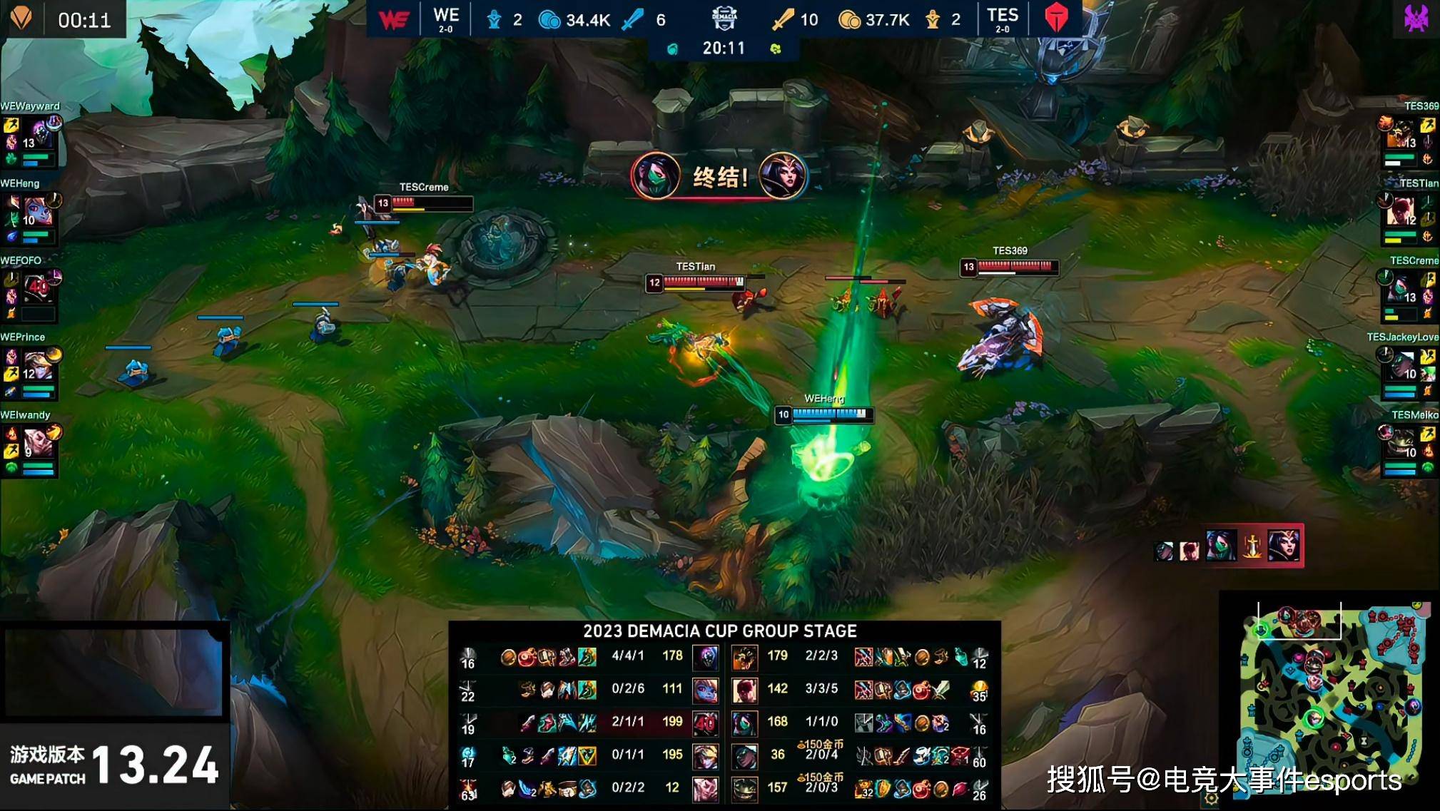 随着比赛进行到了后期,wayward贾克斯这个点终于是有点作用了,可惜他自己太上头,在一波下路高地与369火拼被抓死,WE后续尝试灯下黑偷龙未果,反倒是与TES爆发团战,最终被creme阿卡丽完成收割,打出一波2换4。最终TES在看到wayward下路带线的情况下直接逼大龙,WE干脆一不做二不休,fofo也是交TP想要偷家给压力,结果被赶回来的creme收下双杀,正面战场3V3情况下WE悉数被击杀,之后TES也是轻松收下龙魂,在后续大龙buff的加持下,creme再收下一波三杀,结束了比赛,成功晋级八强。
