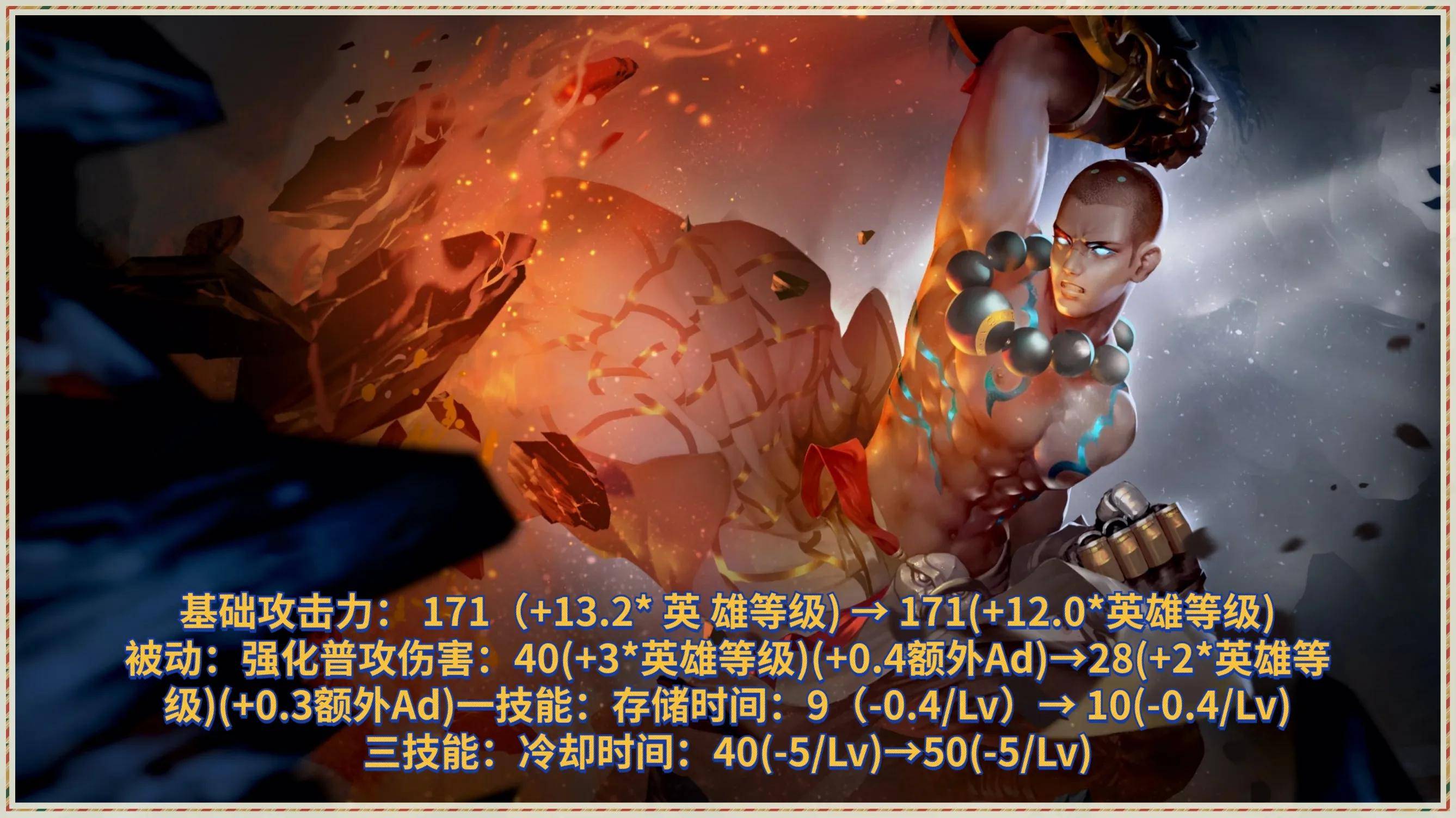 其次是他的强化普攻伤害从原本的40降到28,英雄每级成长加3也变成加2,0.4的额外ad加成也下调到0.3。