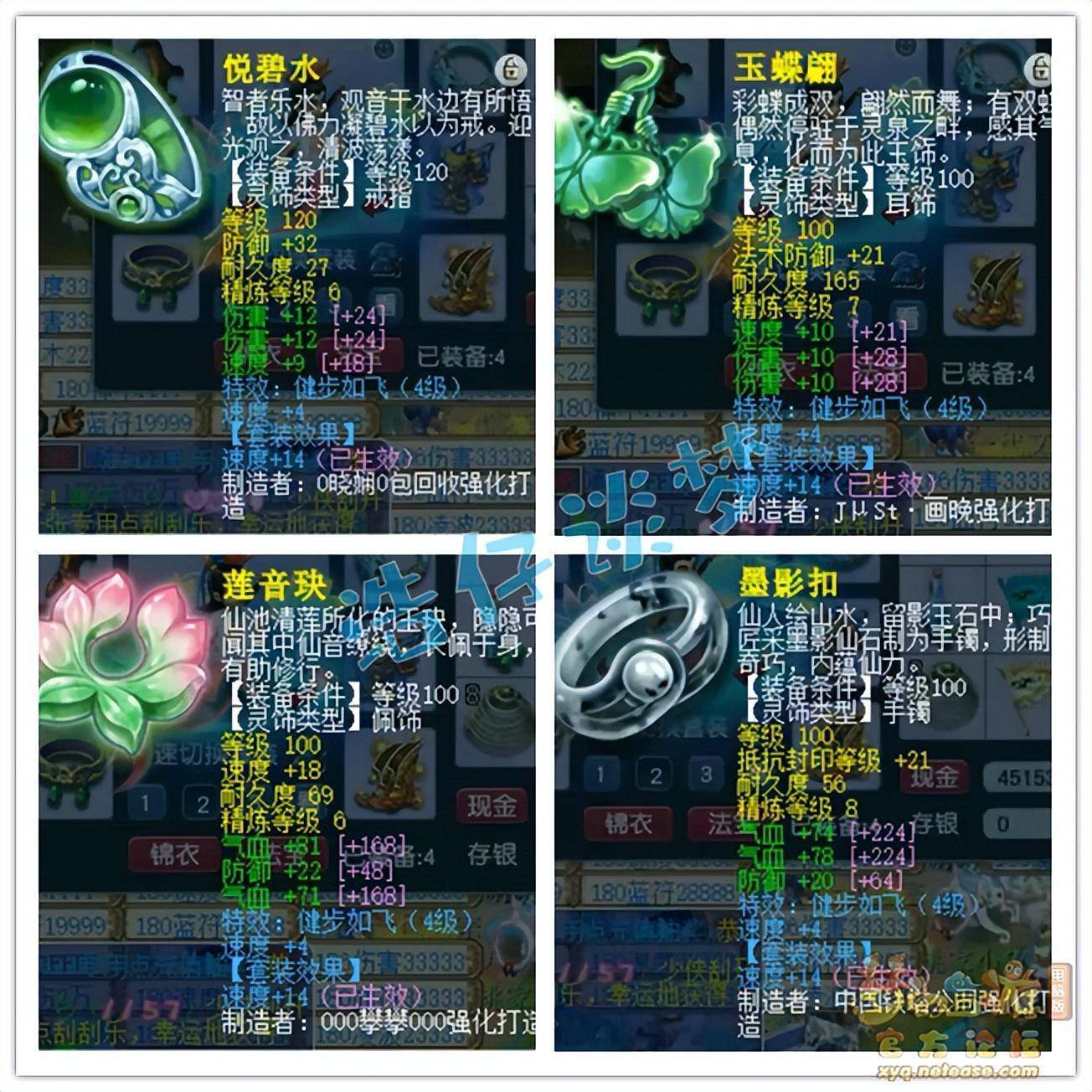 戒指和耳饰下排都是双伤害一速度,佩饰和手镯下排都是双气血一防御,特效都是4级健步如飞!