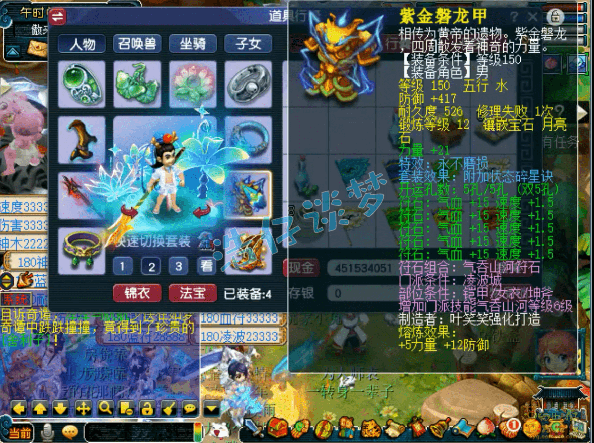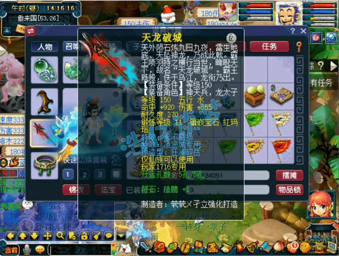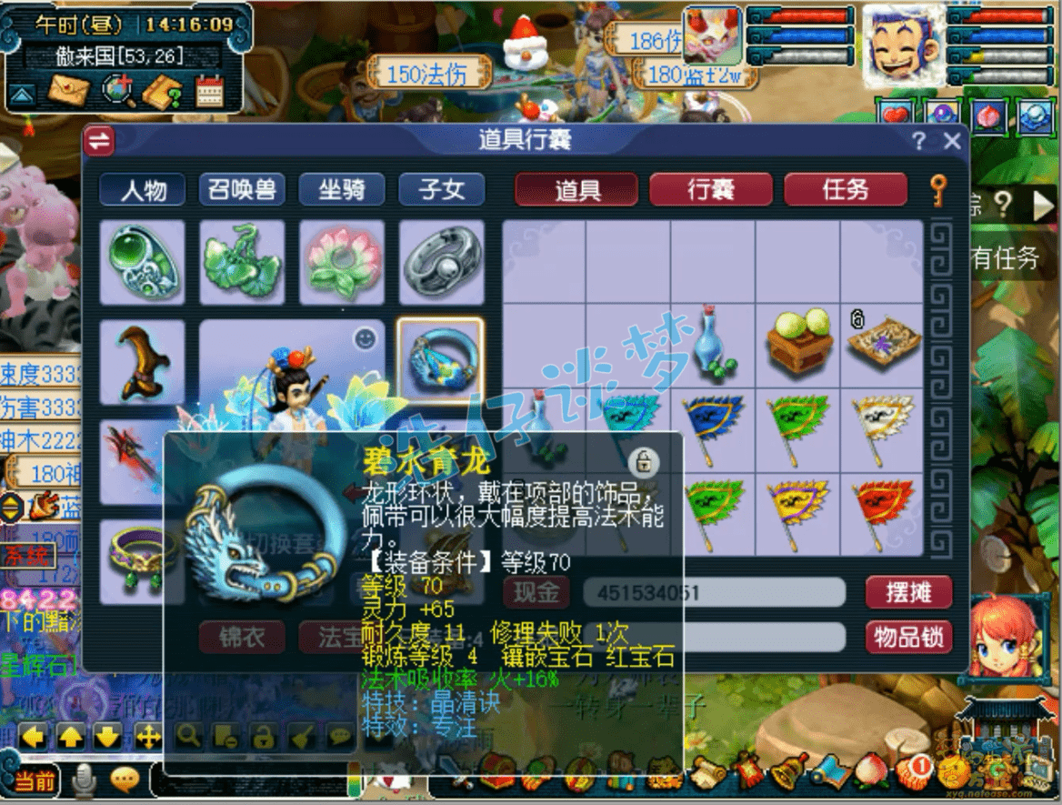这几天给大家展示了很多凌波城的角色,有些是专注于打PK的高端号,有些是专注于刷任务的普通号!两者之间主要的区别就是装备和宝宝的搭配,PK号注重的是特技和锻数,而任务号注重的是不磨!本篇文章浩仔将继续给大家带来凌波城的角色展示,这个号往高了说可以打帮战等PK,但是他的永不磨损装备,又给人一种任务号的感觉!接下来就跟我一起来欣赏一下这个任务与帮战兼顾的凌波城吧!