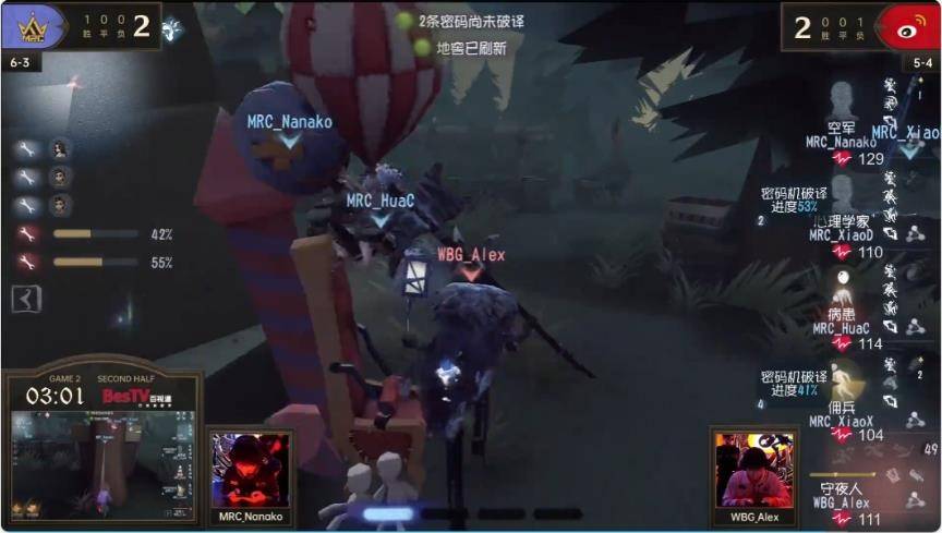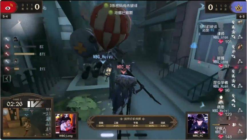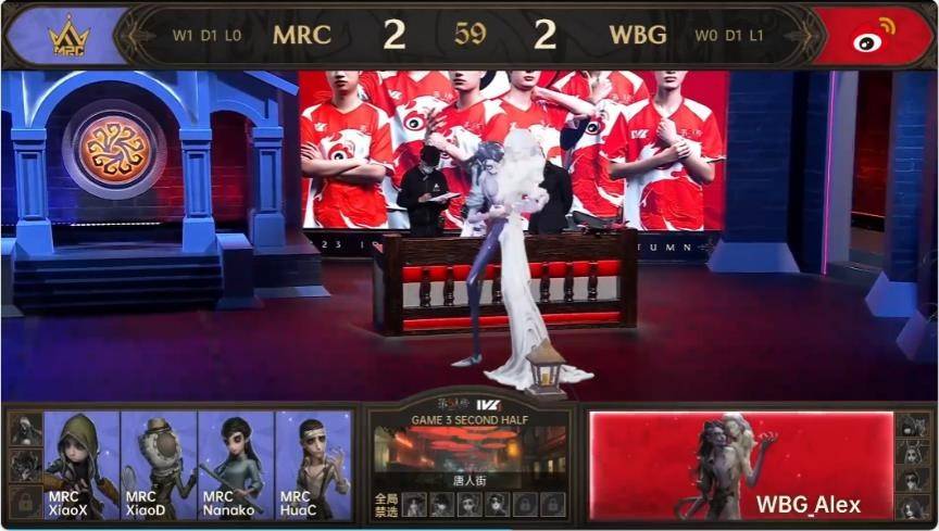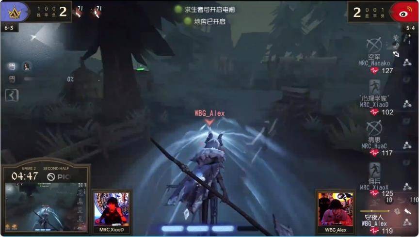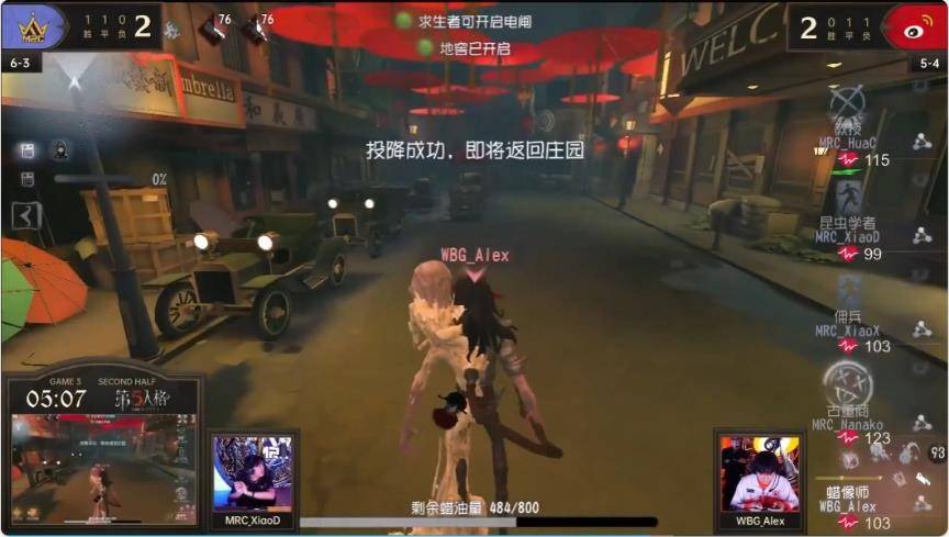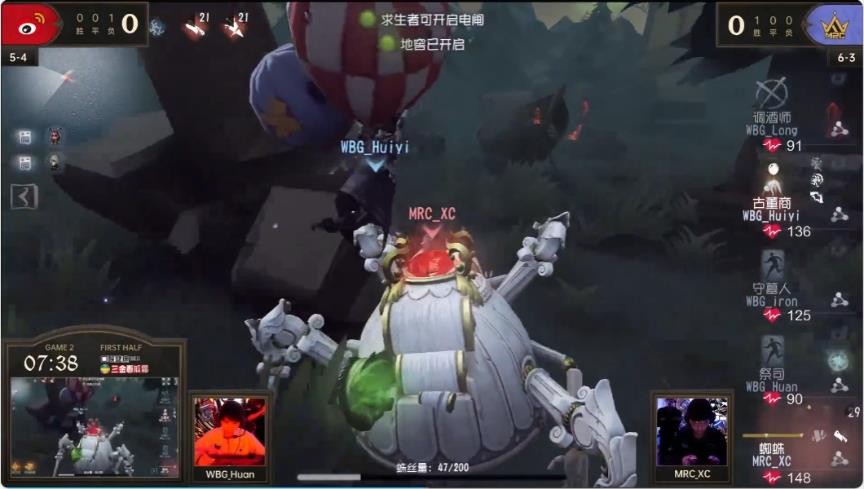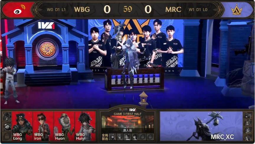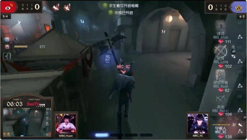 第二局比赛WBG战队和MRC战队以4:4的成绩战平,第三局比赛地图为唐人街,这张地图是求生者偏优势图。