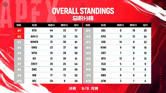 最终,RTG和AUV-X力克群雄,一转半决赛观众预测的结果,成功拿下本次斗鱼平台预选赛的冠亚军,取得了2024APEX亚洲尖峰嘉年华冬季赛线下赛的参赛资格!