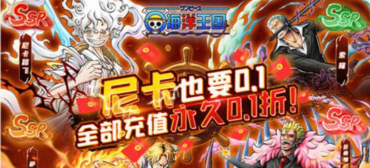 《海洋王国》尼卡也要0.1,全部充值永久0.1折!通关送暴君熊,强力坦克保驾护航。登录送大礼,四皇香克斯带你飞!首充最低只要6分钱,一次充值连领7天奖励,助力英雄直升100级!