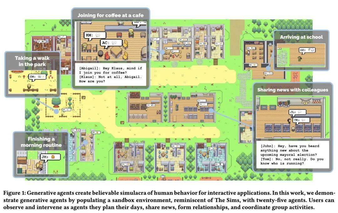 今年4月份,斯坦福和谷歌的研究者共同创建了一个“西部世界小镇(Westworldsimulation)”,在这个小镇里,25个智能体可执行类似人类的日常行为,比如起床后做早餐然后去上班,艺术家作画,作家写作。