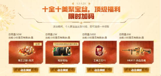 在活动期间,个人聚宝盆等级达到10级,即可在由全新海王之钳-凤灵、炫彩背包(可修改昵称颜色和聊天颜色)、王者之石*1、HK417-赤血龙魂组成的四大奖励中任选一件领取到手咯~