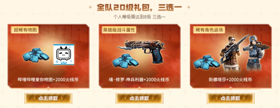 海量组团加倍道具等你升至相应等级即可点击领取,同时个人等级也要满足相应的活动要求哦~全队20级礼包大奖:超稀有喷图 哔哩哔哩爱你喷图+2000火线币、具有英雄级战斗属性的魂·修罗-神兵利器+2000火线币、稀有角色返场的新娜塔莎+2000火线币等你前来三选一!同时个人等级需达到8级哦