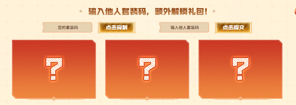 输入他人套装码,额外解锁礼包的方式如上↑↑↑精品道具奖励等你与好友一同领取哦~