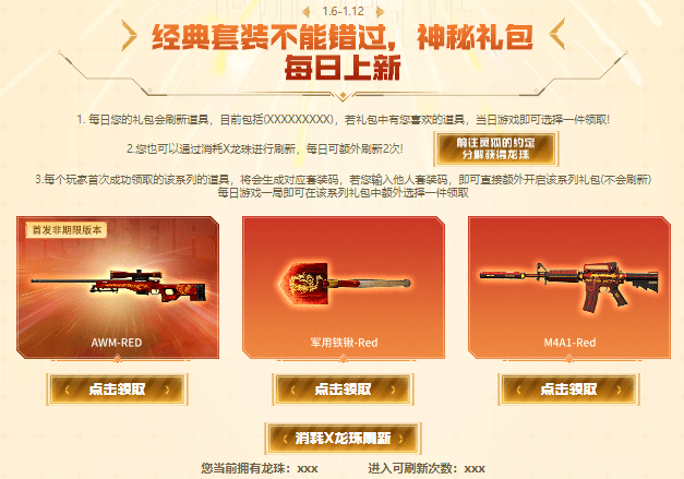 1.6苍龙全套首次发放 三局必可到手!首发非期限版本 沙漠之鹰-苍龙、AK47-苍龙、Barrett-苍龙组成的苍龙套装等你三局全部领取到手咯!同时还有经典RED系列道具福利等你前来领取收藏~那么,我们话不多说,直接上图~
