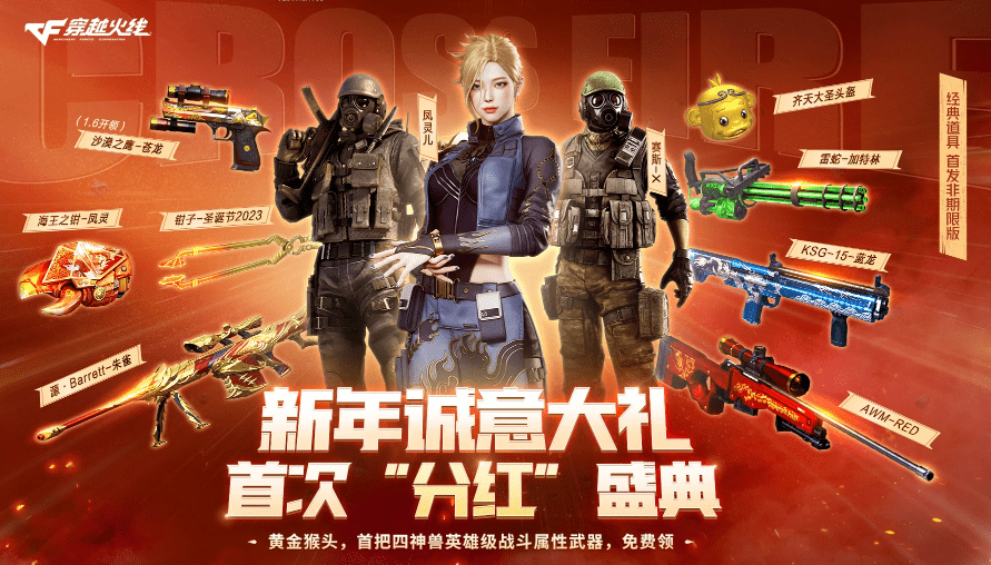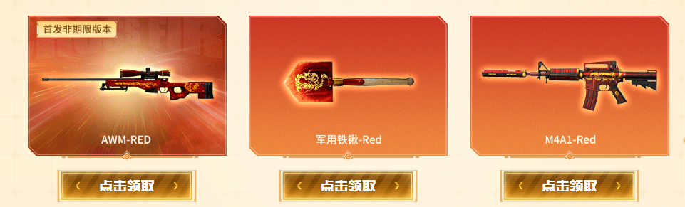 首发非期限版本AWM-RED、军用铁锹-Red、M4A1-Red等收藏级道具福利,直接等你前来领取到手!