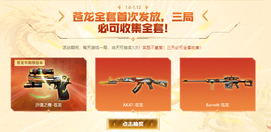 在活动期间,每天游戏一局,当天即可抽奖1次!首发非期限版本 沙漠之鹰-苍龙、AK47-苍龙、Barrett-苍龙等你三天必拿全套收藏到手哦~