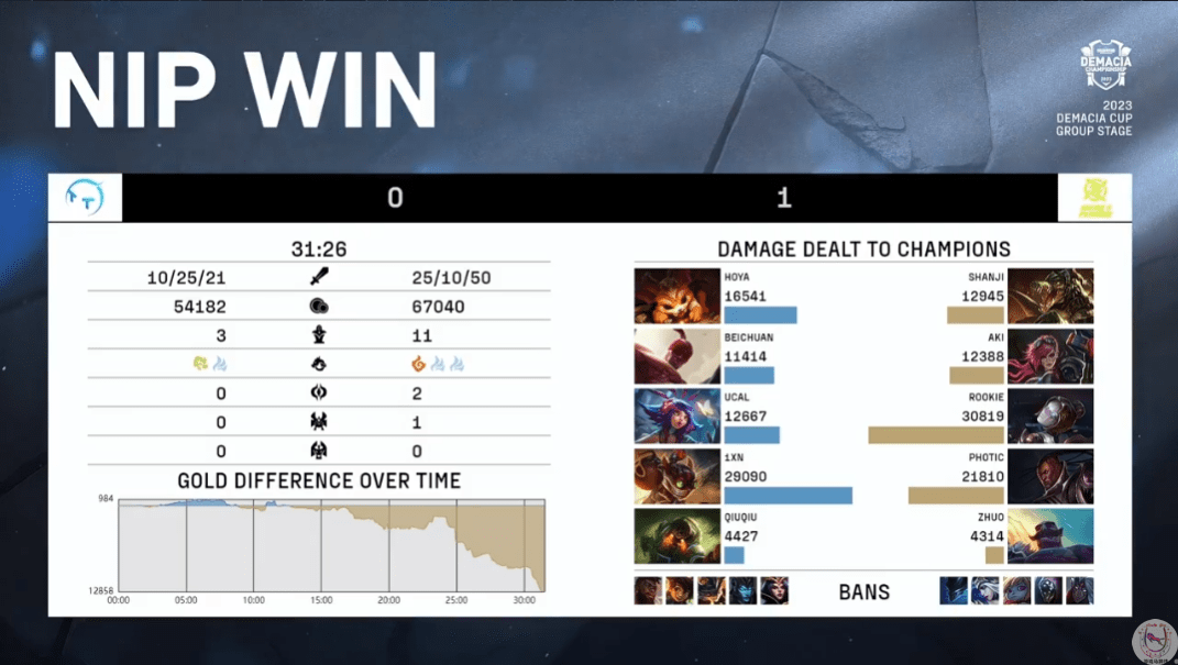 原本以为同组此前在大师赛表现出色的EDG会很强,结果没想到0-3直接被淘汰了。TT去年德杯就进入了决赛,今年发挥也不错,而NIP因为有了Rookie,Shanji和Aki的加入,变得比以前强势了很多。两队此前都是拿到了2-0的战绩,在最后的双方决胜局中,NIP还是技高一筹最终以3-0晋级八强。