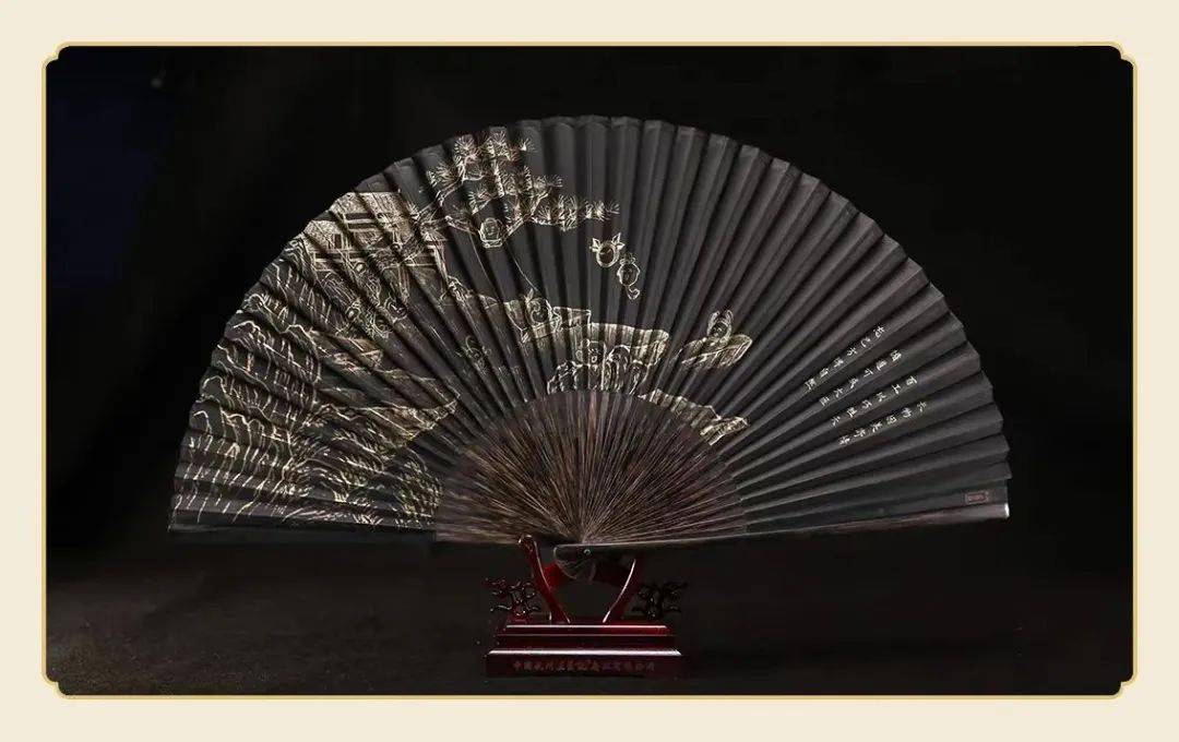 黑纸扇的手艺流传至今,已演变为了一套复杂且成熟的工艺,除了之前提到的选材用料,扇面上的金粉绘画更是一绝,需要根据扇骨的位置,调整下笔轻重,展现题材的明暗关系,保证成品从各个角度观赏,都能光彩夺目,大气斐然。入木三分的功力,只为在这一方黑扇上绘制出《百工灵》的主题扇面,黑金配色下的“百工灵”惟妙惟肖。