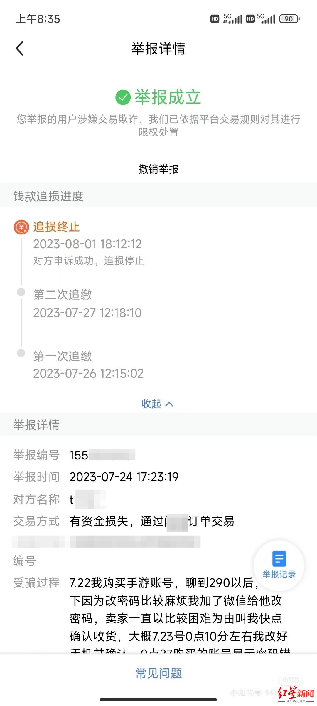 四川的李女士今年7月通过某交易平台购买了一个价值290元的游戏账号,被对方“恶意找回”。这是她第一次遇到这类状况。12月21日,她向记者回忆,当时在发现登录不上账号后,她立即向平台方进行申诉,由于申诉及时,交易资金被平台方冻结后追回。工作人员告诉她,对方曾两次明确表示拒绝还钱,“如果没有冻结,骗子第一时间拿到钱转走可能就追不回来了。”